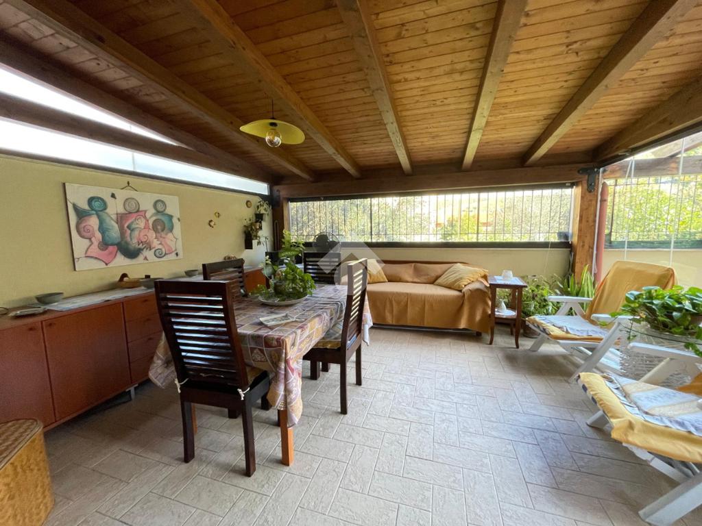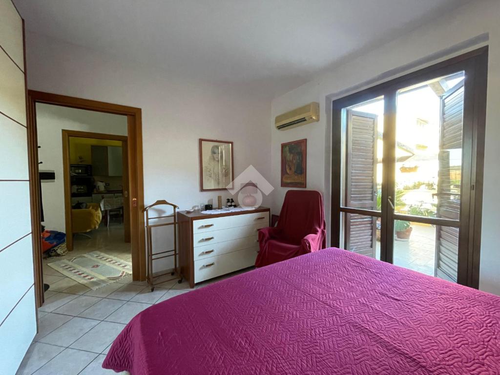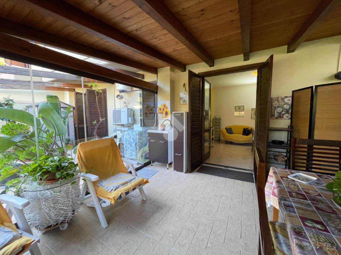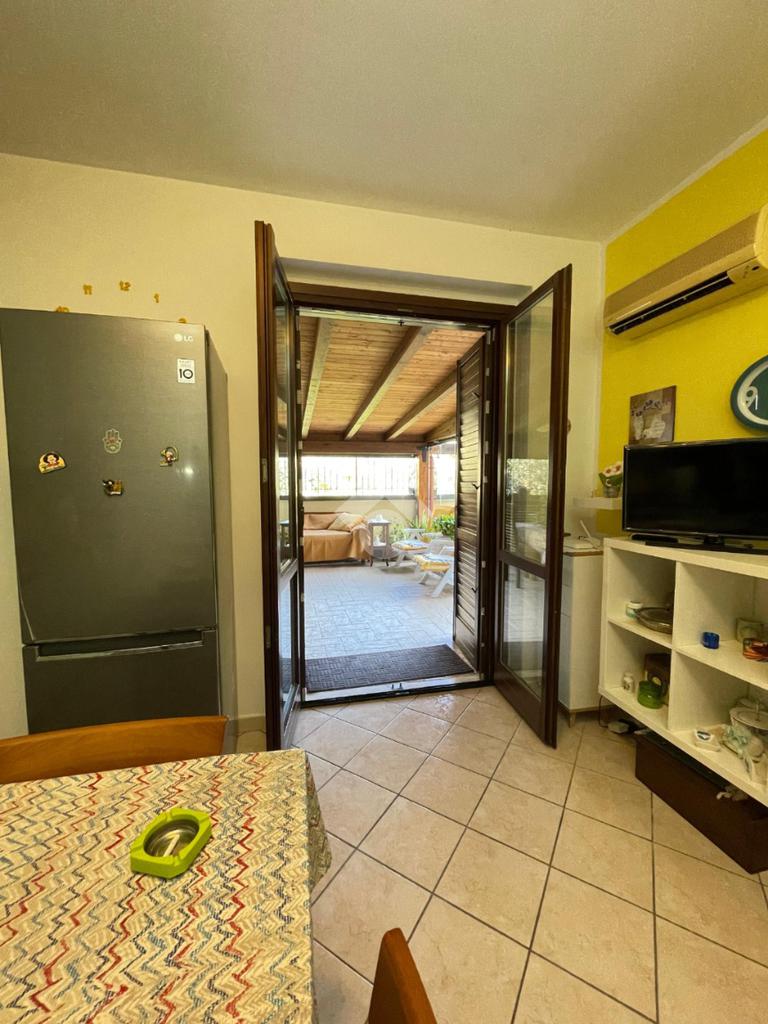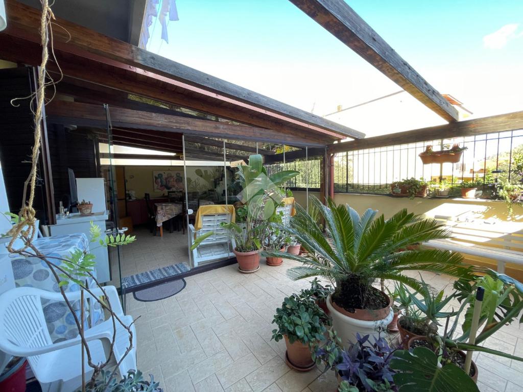 L' ingresso ci accoglie su di una comoda saletta , dalla quale si accede ad una camera da letto matrimoniale con affaccio sul terrazzo , un wc bagno e cucina abitabile con uscita sempre sul terrazzo in parte coperto con struttura in legno lamellare e vetro.